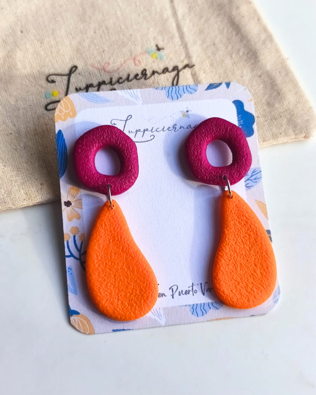 Aros diseñados y confeccionados a mano en arcilla polimérica. Cada par pasa por un proceso cuidadoso de modelado, horneado y ensamblaje, lo que da como resultado piezas originales y llenas de carácter.