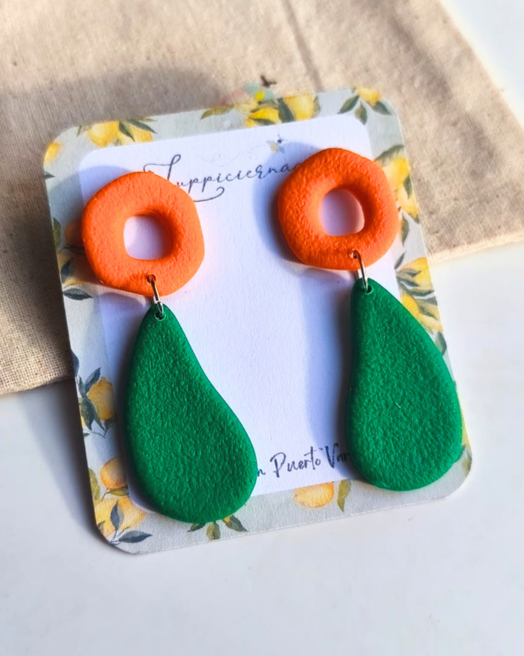 Aros diseñados y confeccionados a mano en arcilla polimérica. Cada par pasa por un proceso cuidadoso de modelado, horneado y ensamblaje, lo que da como resultado piezas originales y llenas de carácter.